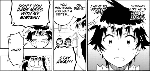 Nisekoi does a good job of showing how ONEECHAN can be used for both actual older sisters and for girls who are older than you but not actually your sister. When Haru is introduced in Nisekoi, she is very protective of her older sister. She’ll do anything to shield her ONEECHAN from that panty-peeping Raku!
