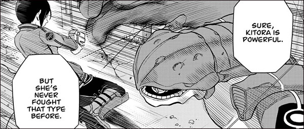 Kitora takes on the new, and more powerful Trion soldier! If you've been hankering for a knock-down drag-out fight in World Trigger, this is your chapter! Kitora thinks highly of her abilities, but Trion soldiers aren't impressed by swagger. Is it all talk? Or can she walk the walk?